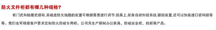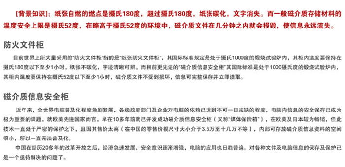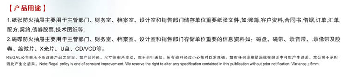 1,紙張防火抽屜主要用于主管部門,財務室、檔案室、設計室和銷售部門儲存單位重要紙張文件,如:帳簿、客戶資料、合同書、借據(jù)、訂單、匯單、配方、契約、債券股票、技術圖紙等;